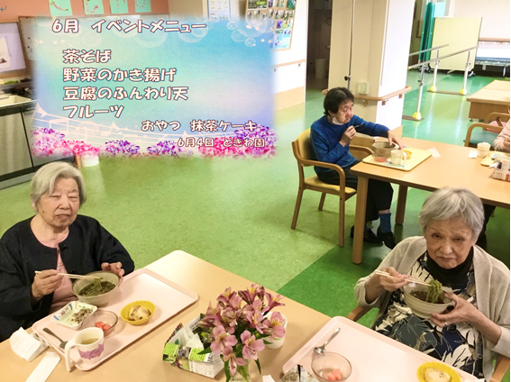 本日の昼食風景です。じめじめした本日は茶そばが好評でした。