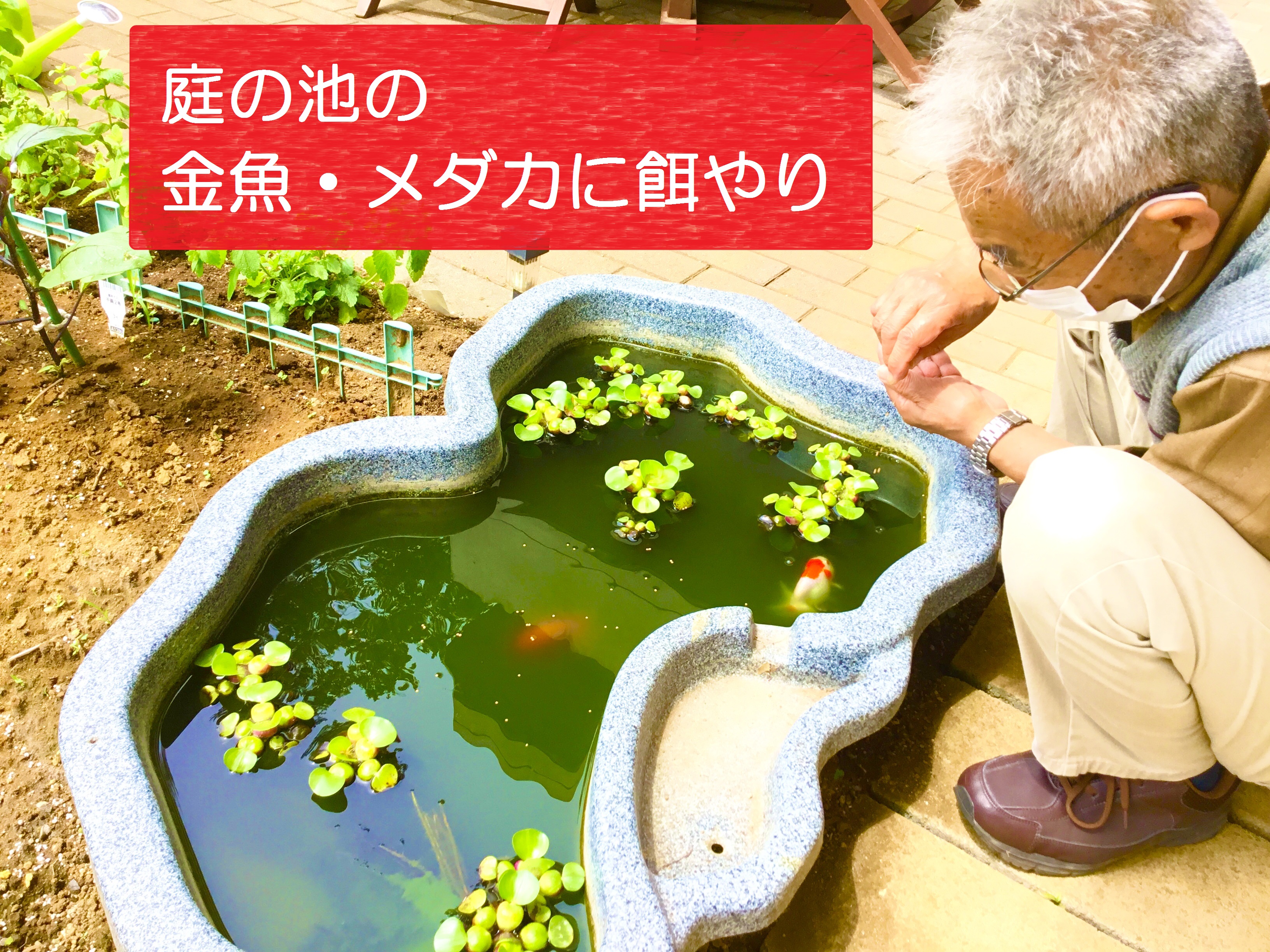 庭の池にはランチュウと黒メダカが泳いでおり、皆様が可愛がっております。
