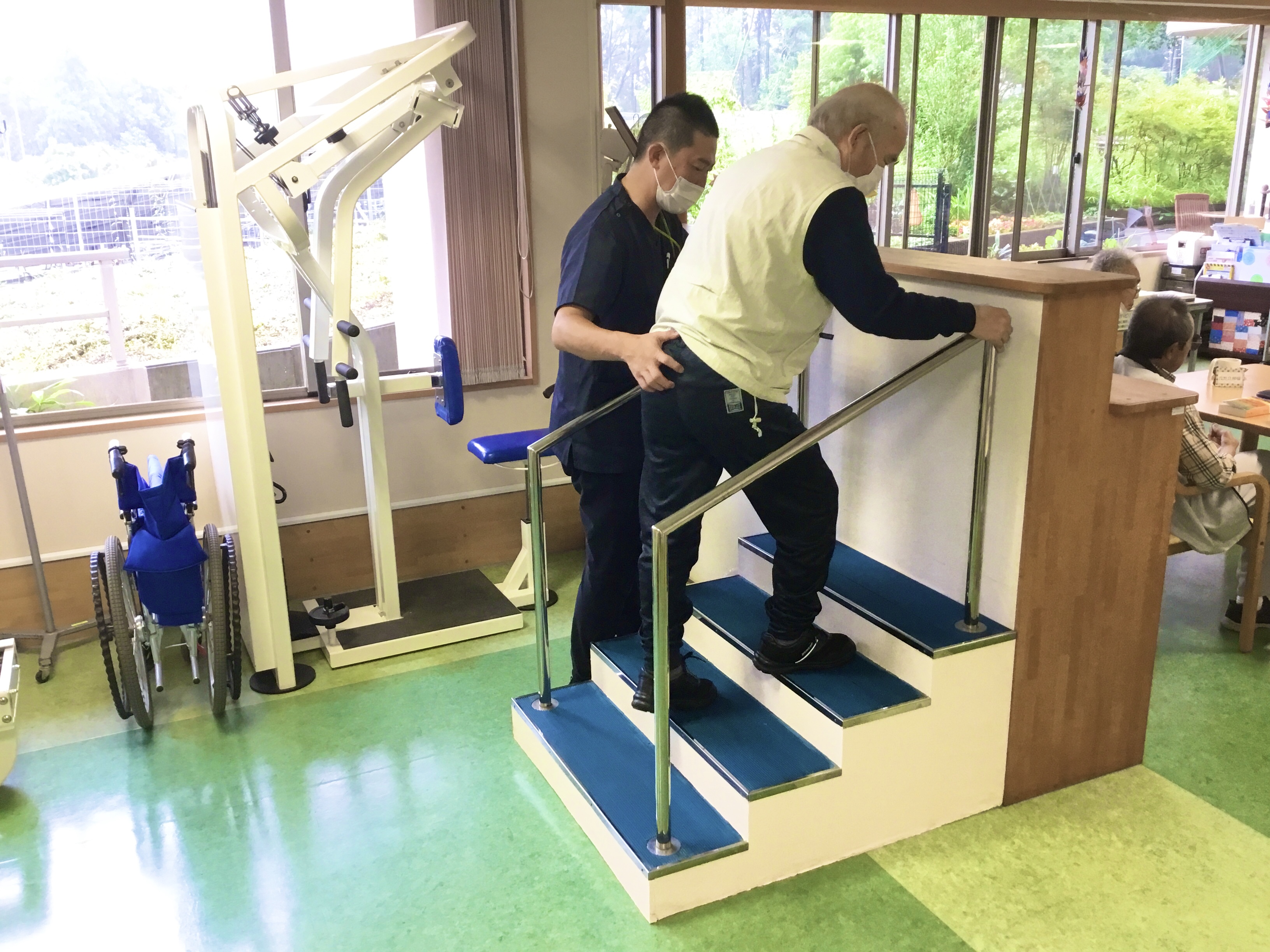 当施設に新しいリハビリ設備が追加されました。皆さん意欲的に取り組んでいただいています。