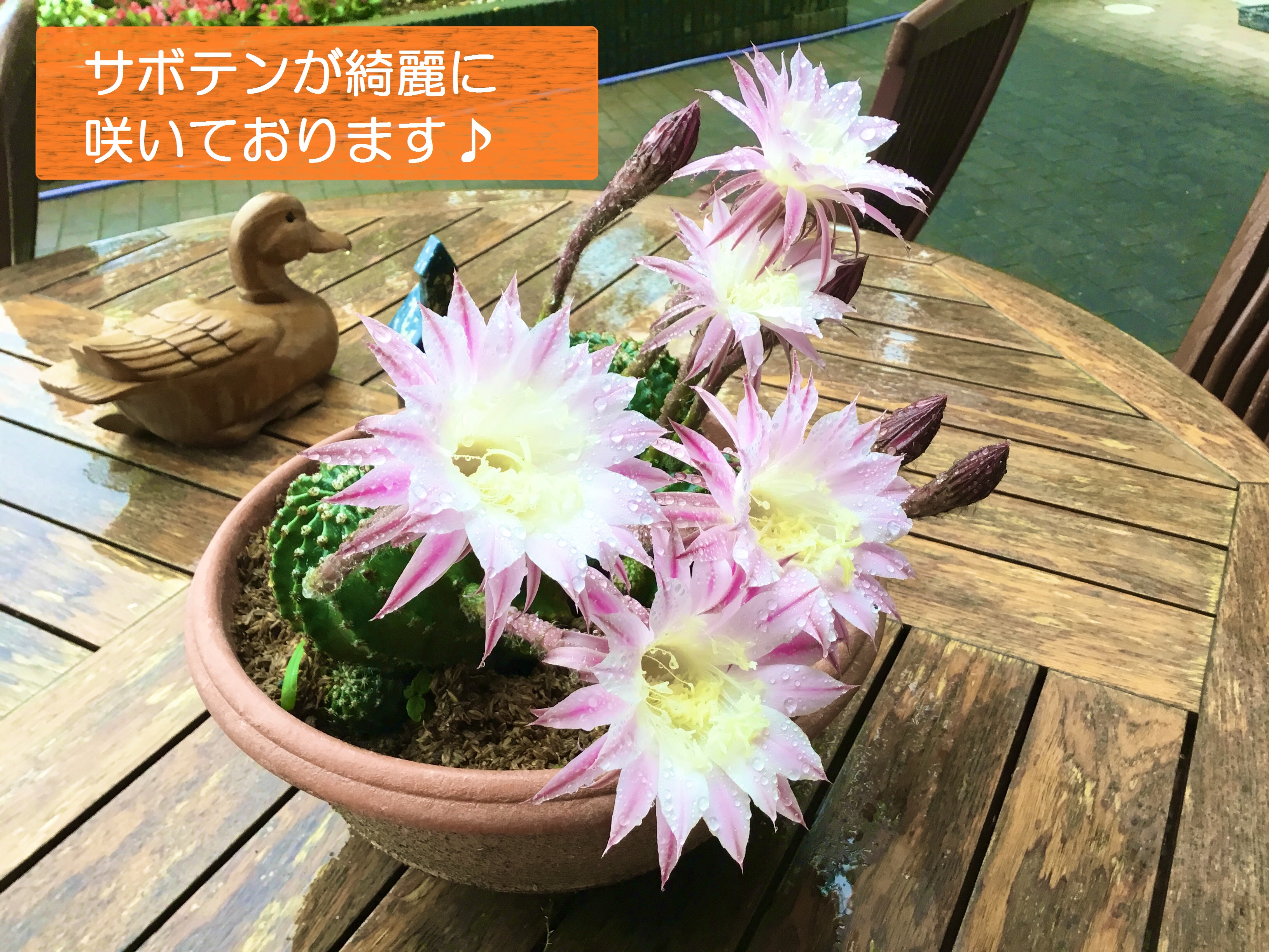 皆様のお手入れの甲斐あって、庭のサボテンにたくさんの花が付きました。
