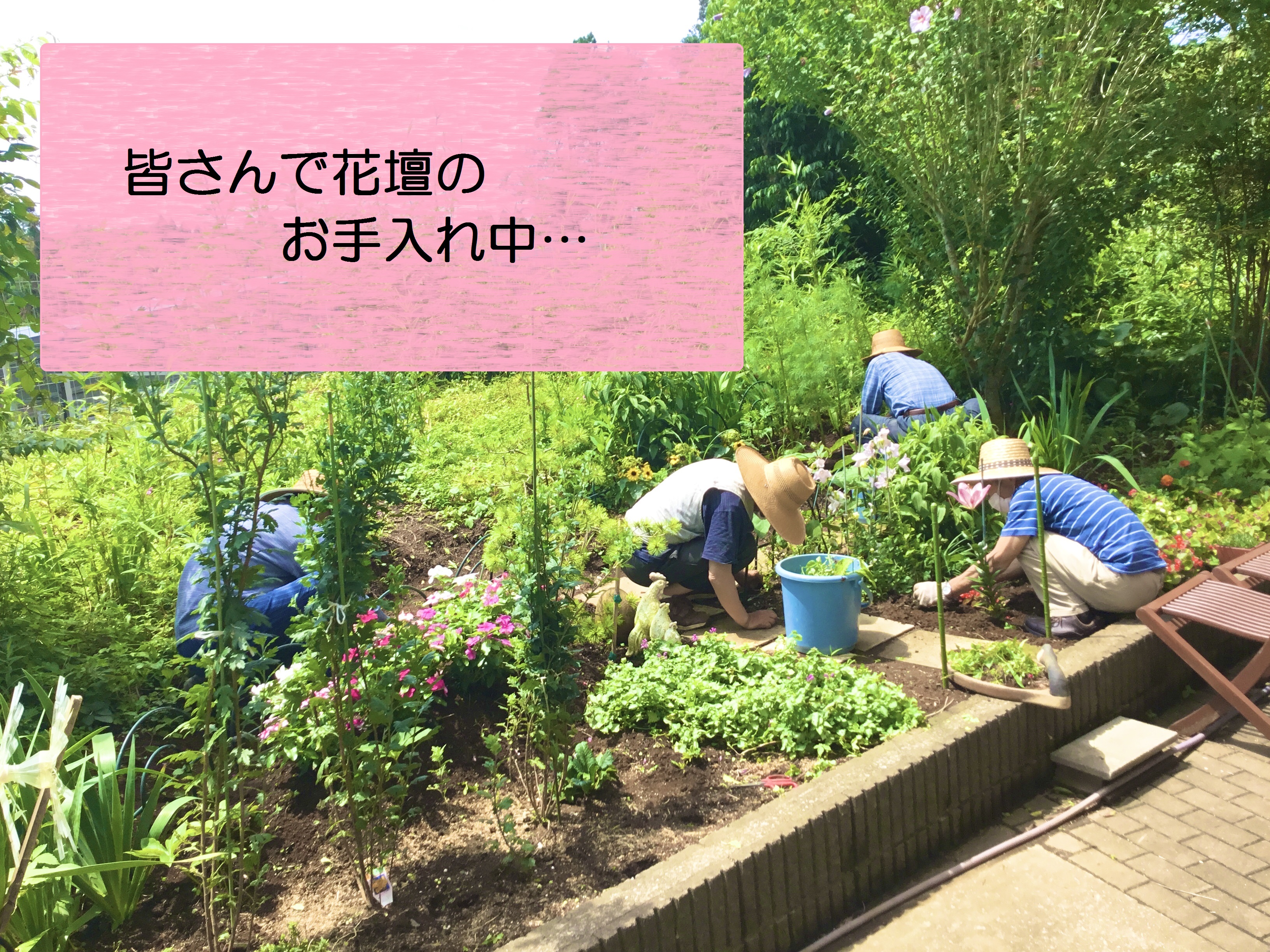 花壇の草が増えてきたと、日が高くなる前に皆さんで草取り作業をされています。