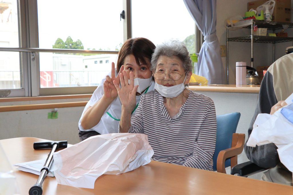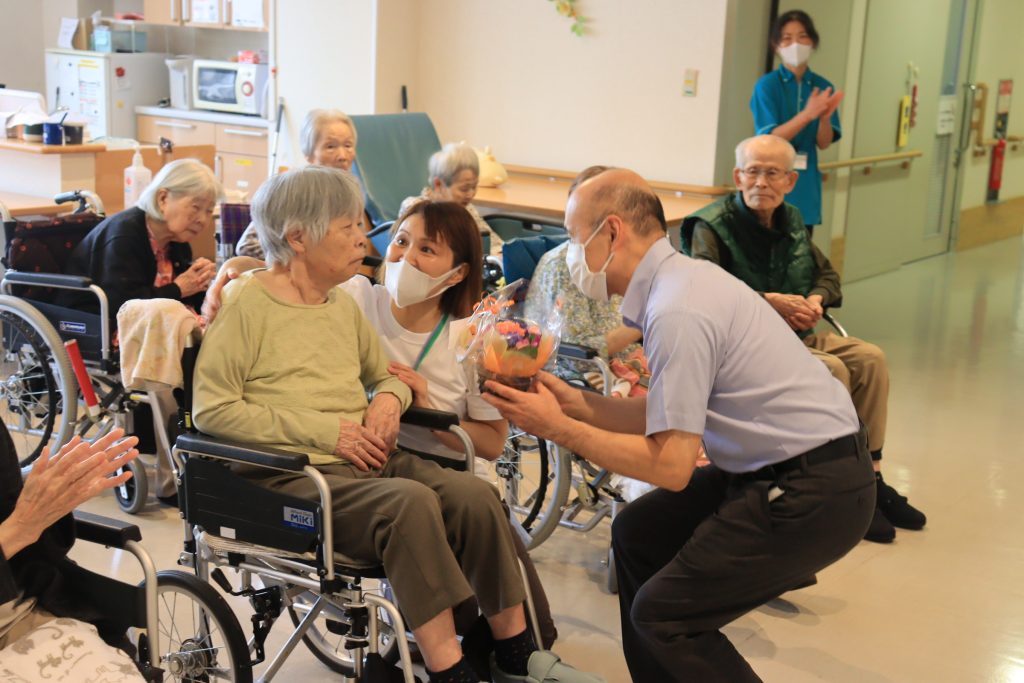 今年の敬老会では、喜寿が1名、米寿が9名、95歳以上が8名で、花束が贈呈されました。そして、すべてのご利用者にもプレゼントが贈呈されました。ご利用者の皆様がいつまでもお元気でお過ごしになれるよう、心より願う素晴らしいひと時となりました。